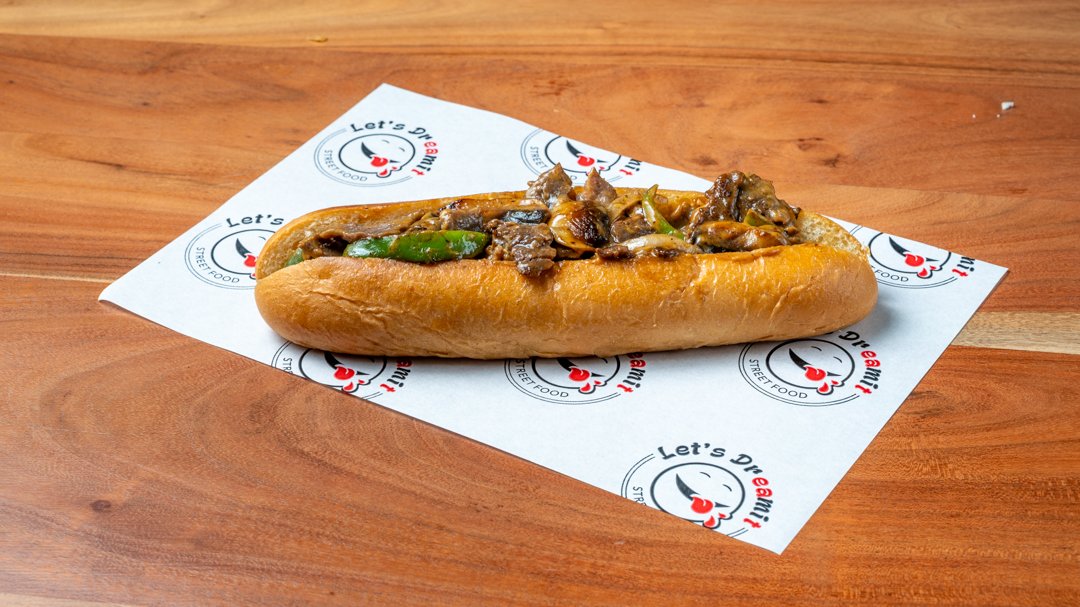 Με λεπτοκομμένες φέτες μοσχαριού, μανιτάρια, τσένταρ, πιπεριά, κρεμμύδι, προβολόνε, bbq sauce