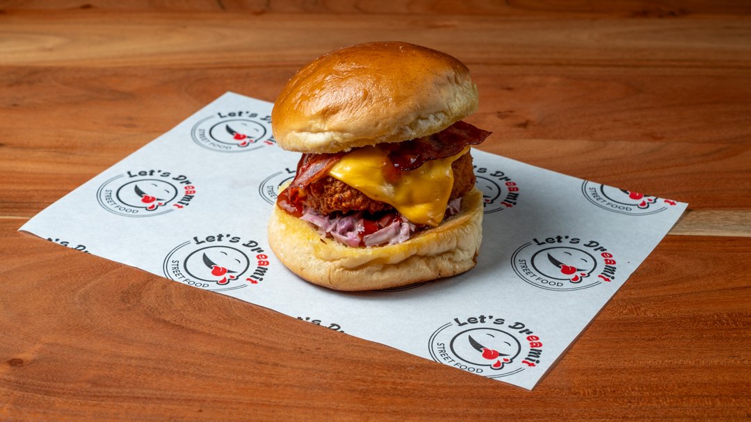 Ψωμί brioche με τηγανητό κοτόπουλο, τσένταρ, μπέικον, chilli sauce, coleslaw