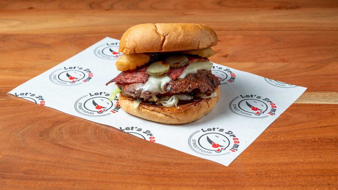 Potato bun με διπλό μπιφτέκι, τσένταρ, μπέικον, καραμελωμένο κρεμμύδι, cocktail sauce, iceberg