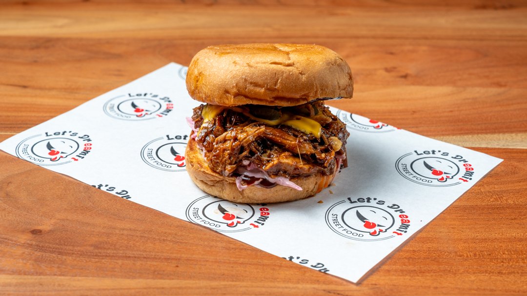 Potato bun, σιγομαγειρεμένο χοιρινό, τσένταρ, πίκλα αγγούρι, τηγανητό κρεμμύδι, coleslaw, bbq σως