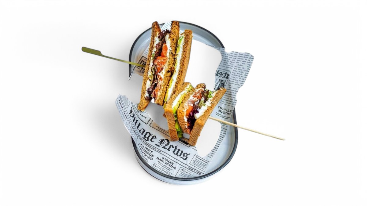 ψωμί ολικής με καπνιστό σολομό, τυρί κρέμα, ντομάτα, spread αβοκάντο & πράσινη σαλάτα. Συνοδεύεται από τηγανητές πατάτες