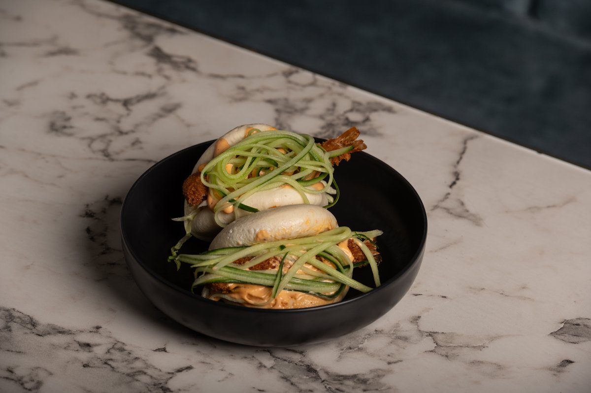 Aφράτο bao bun με γαρίδα tempura, mayo sriracha και λαχανικά