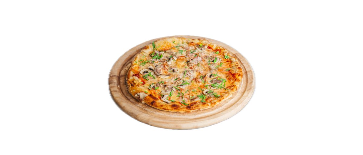 Σάλτσα, mix τυριών, ζαμπόν, μπέικον, πεπερόνι, μανιτάρια, πιπεριά