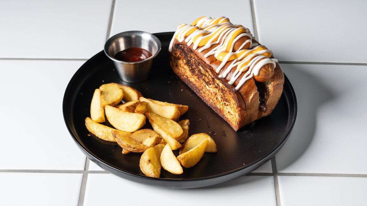Με λουκάνικο, τσένταρ σως, καραμελωμένο κρεμμύδι και μαγιονέζα, σε lobster ψωμί με τηγανητές πα΄τατες