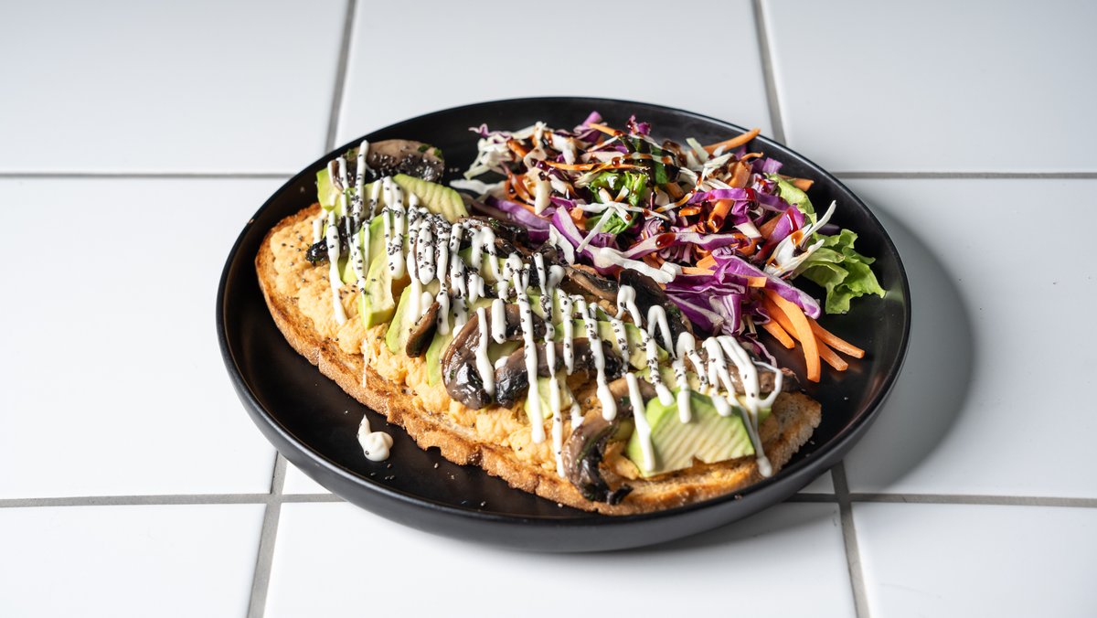 Επτάζυμο ψωμί αργής ωρίμανσης με προζύμι σίκαλης με smashed αβοκάντο , μαρούλι , βραστό αυγό , μανιτάρια και δροσερή σως γιαουρτιού με δυόσμο