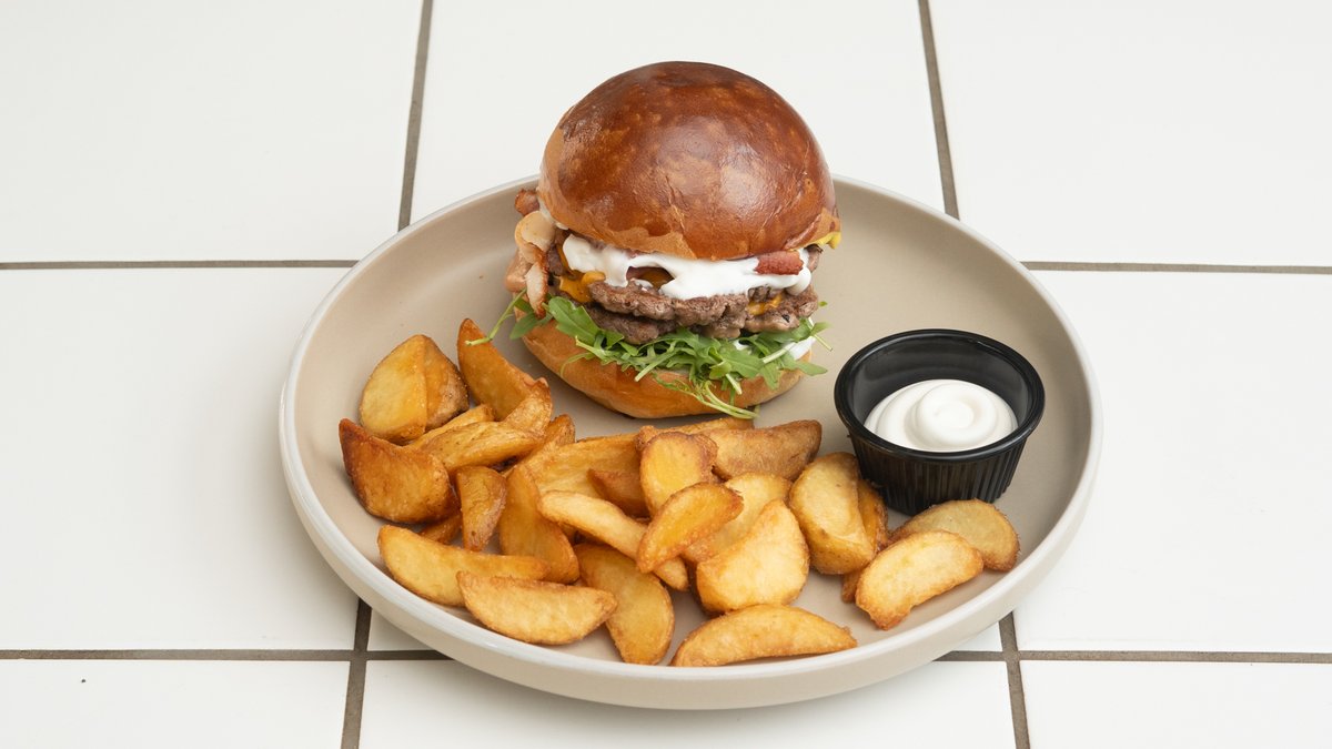 Ψωμάκι brioche , διπλό smashed 100% μοσχαρίσιο μπιφτέκι , διπλό τσένταρ , ρόκα , μπέικον και σως μαύρης τρούφας