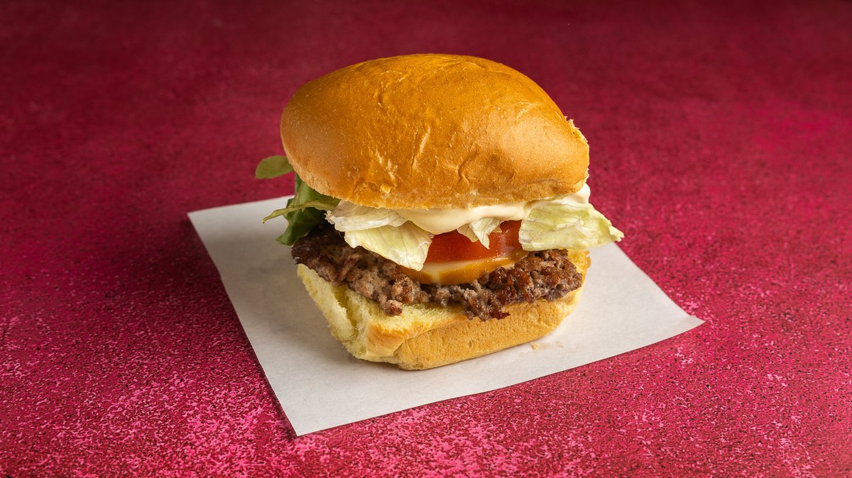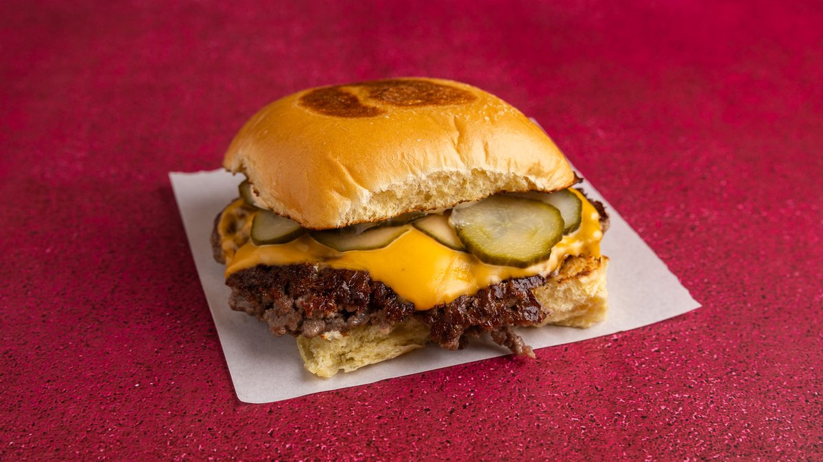 Με potato bun, smashed μπιφτέκι, American cheese, κέτσαπ, πίκλες αγγουριού και μαγιονέζα