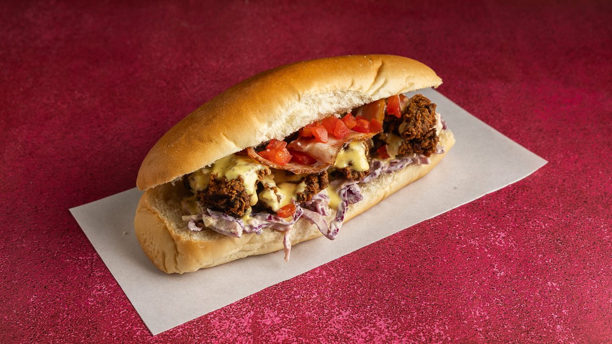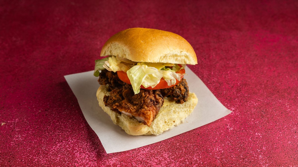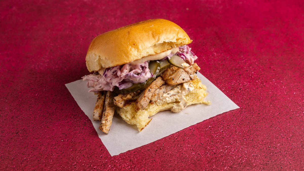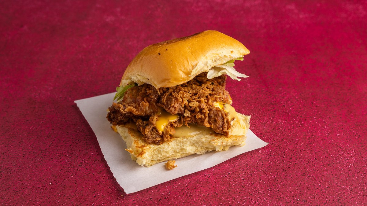 Με ψωμάκι βουτύρου, buttermilk fried chicken, American cheese, truffle mayo, καπνιστό bacon και coselaw