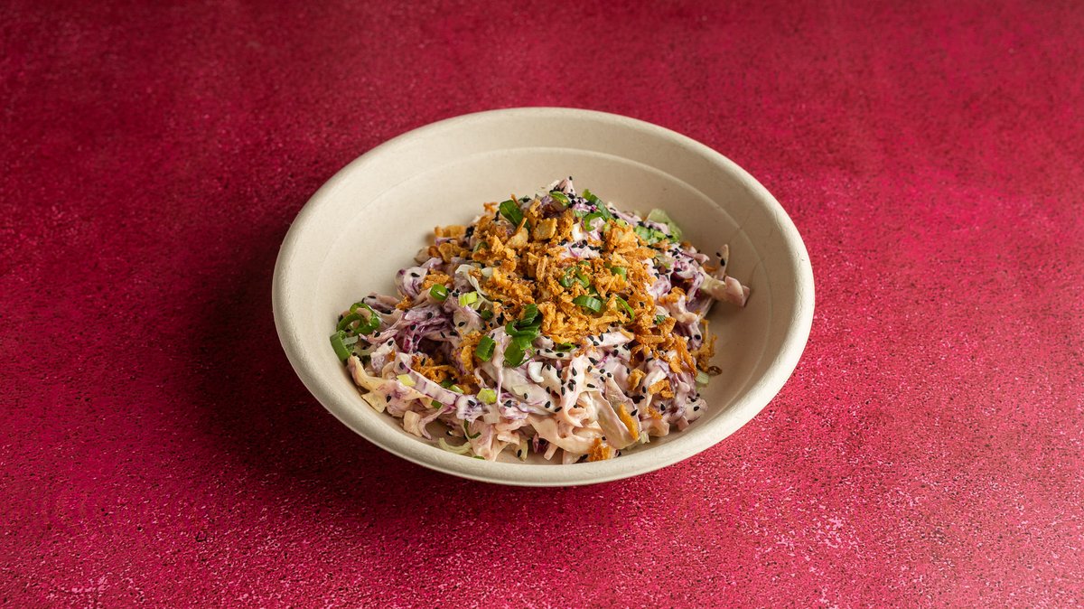 Με λευκό και κόκκινο λάχανο, καρότο, μαγιονέζα, crispy onion και σουσάμι