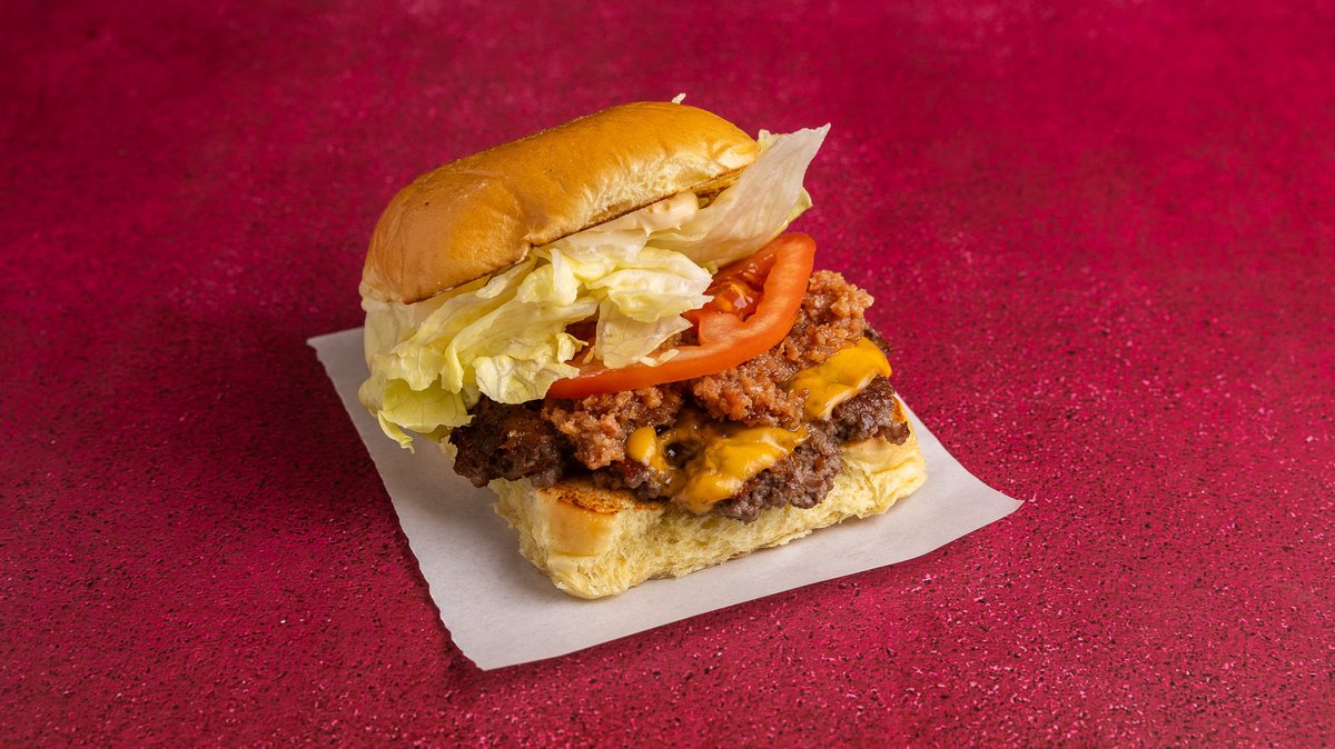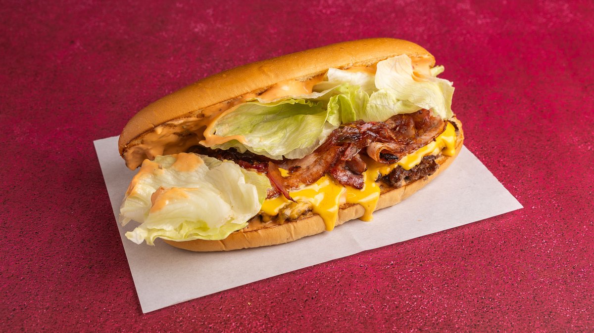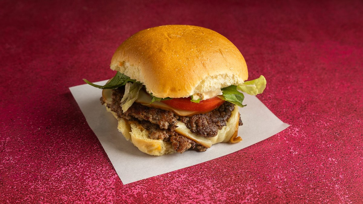 Με ψωμάκι βουτύρου, double smashed μπιφτέκι, American cheesem καπνιστό bacon, dunk sauce, καραμελωμένα κρεμμύδια και iceberg