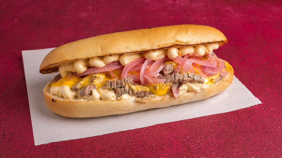 Με ψωμάκι βουτύρου, μοσχαρίσιο φιλέτο, cheddar sauce, τριμμένη gouda και πίκλα κρεμμύδι
