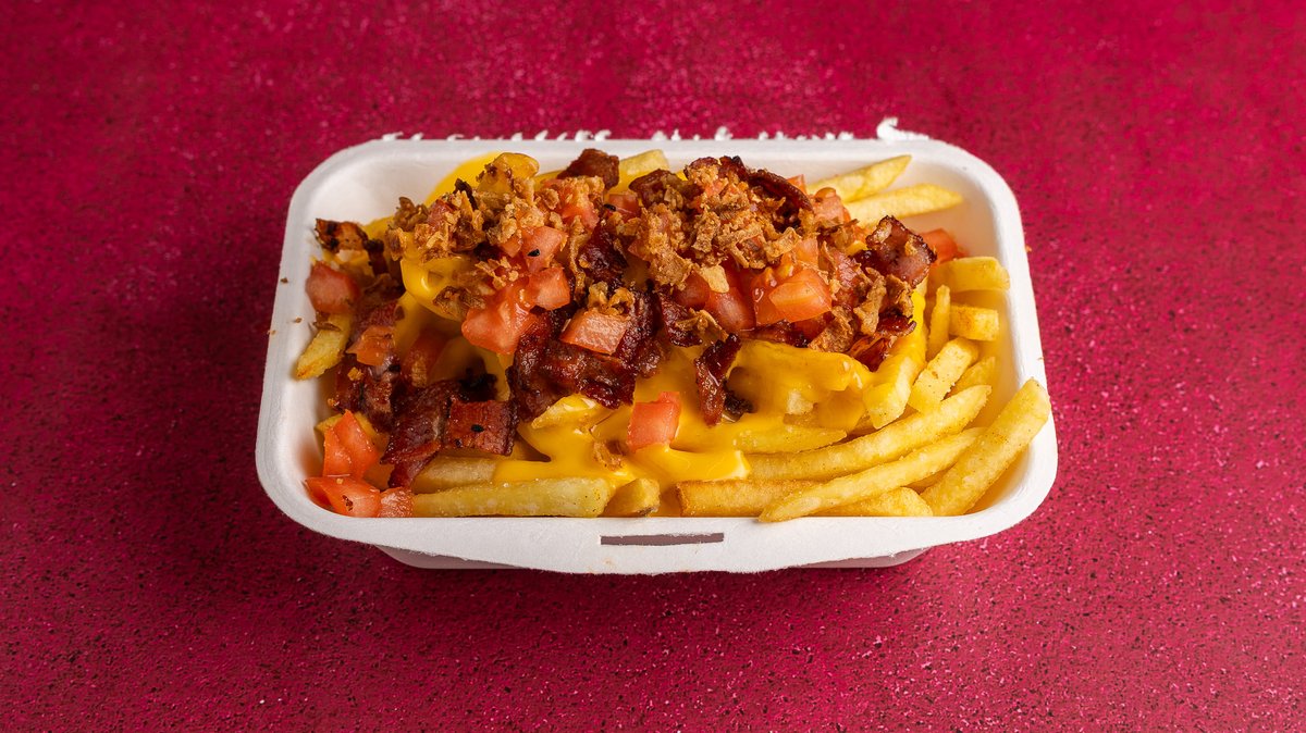 Με cheddar sauce, καπνιστό bacon, cubes tomato και crispy onion