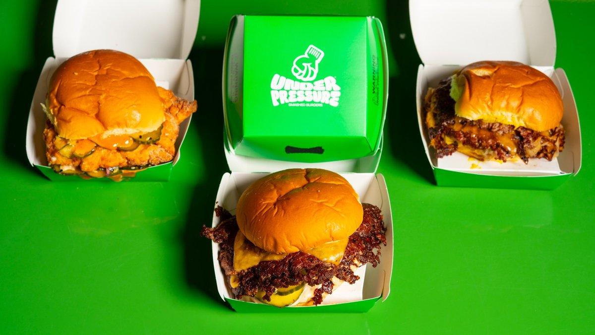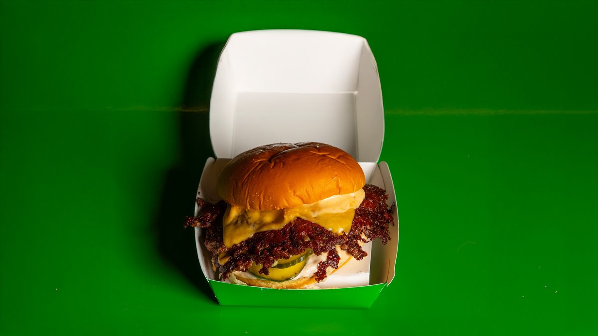 Με διπλό 100% μοσχαρίσιο smashed μπιφτέκι 160 g, cheddar, χειροποίητη πίκλα αγγουριού, λεπτοκομμένο iceberg και house sauce