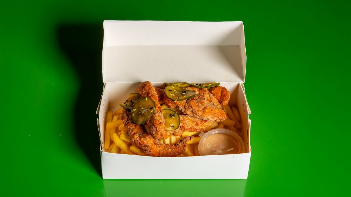 5 τεμάχια. Χειροποίητα τραγανά παναρισμένα φιλέτα κοτόπουλο. Συνοδεύεται από τηγανητές πατάτες, asian style πίκλες και house sauce