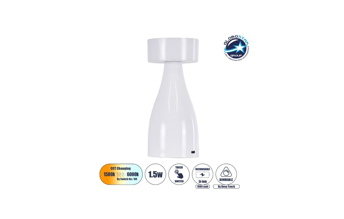GloboStar® Dolly 76466 Μοντέρνο Επιτραπέζιο Φωτιστικό Πορτατίφ LED 1.5 W 105 lm 120° DC 5 V Επαναφορτιζόμενο με Μπαταρία Li-ion 1800 mAh - Διακόπτης Αφής με 3 Εναλλαγές Φωτισμού CCT Θερμό - Ψυχρό 1500 K - 6000 K Dimmable - D9 x 21 cm - Λευκό - 7039