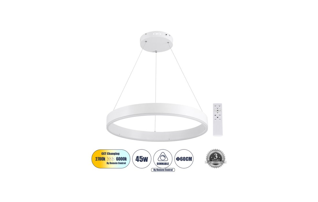 GloboStar® Venom 61177 Κρεμαστό Φωτιστικό Δαχτυλίδι LED CCT 45 W 5269 lm 120° AC 220-240 V - Εναλλαγή Φωτισμού μέσω Τηλεχειριστηρίου All-In-One Ψυχρό 6000 K + Φυσικό 4500 K + Θερμό 2700 K Dimmable Φ60 cm - Λευκό - 7269