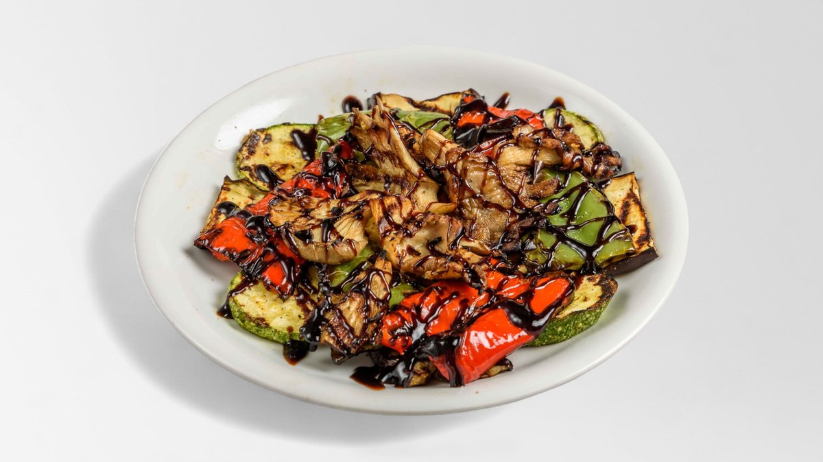 Με κολοκυθάκια, μελιτζάνες, μανιτάρια, πιπεριές, ντομάτα και κρέμα βαλσάμικο