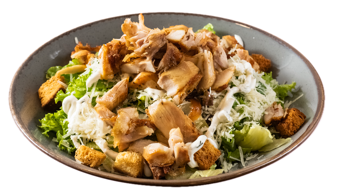 Με κοτόπουλο, iceberg, κρουτόν, καλαμπόκι, dressing μουστάρδας, και παρμεζάνα
