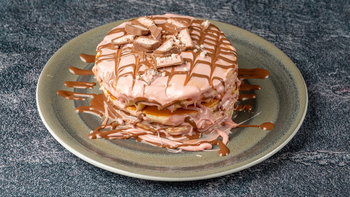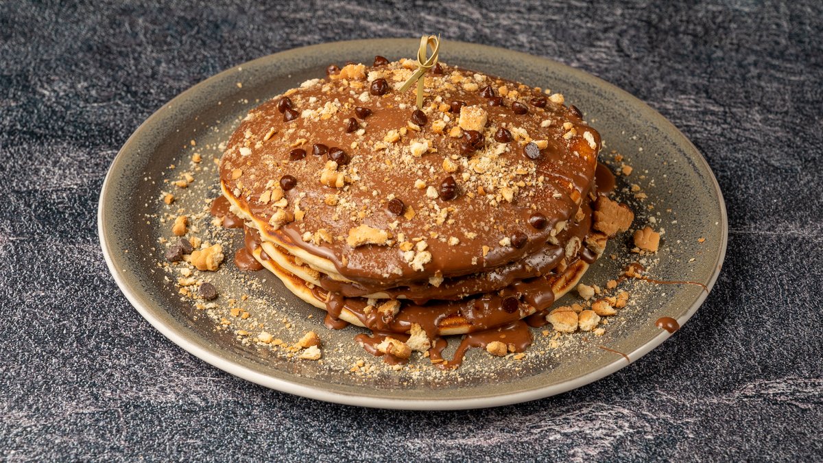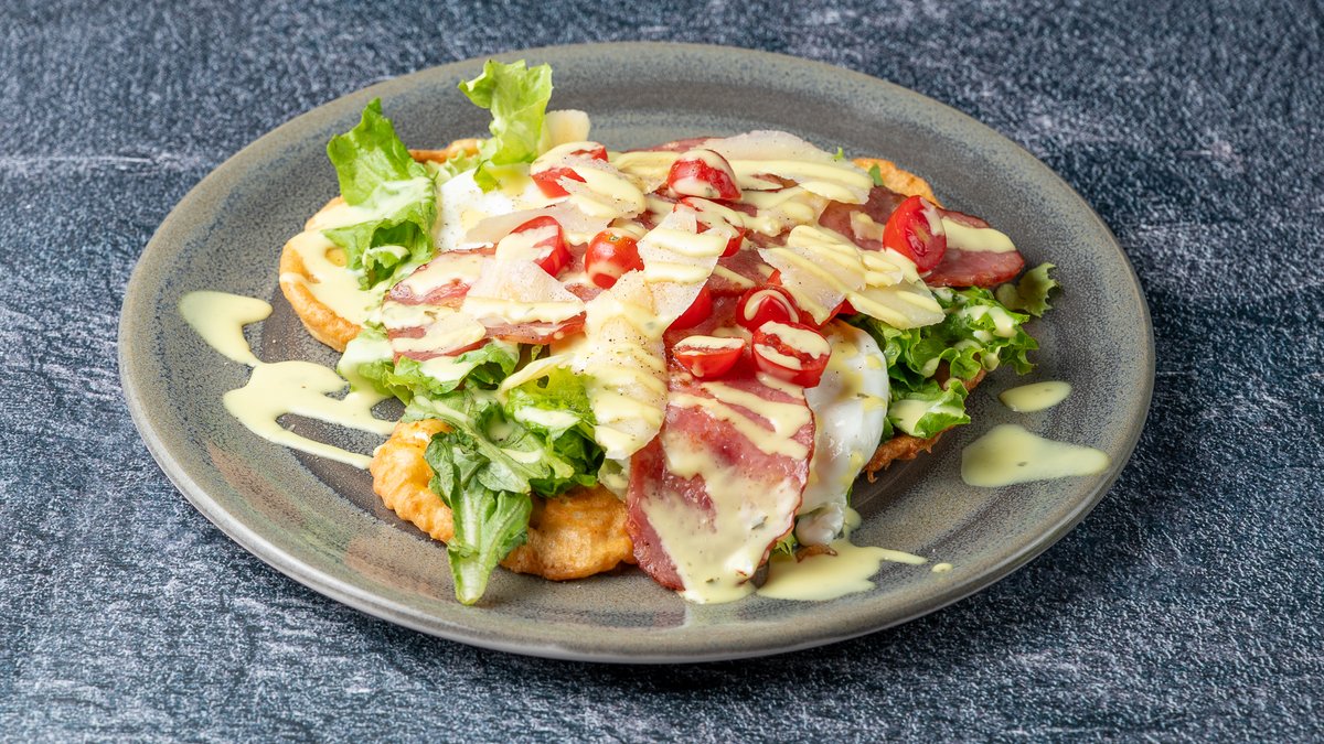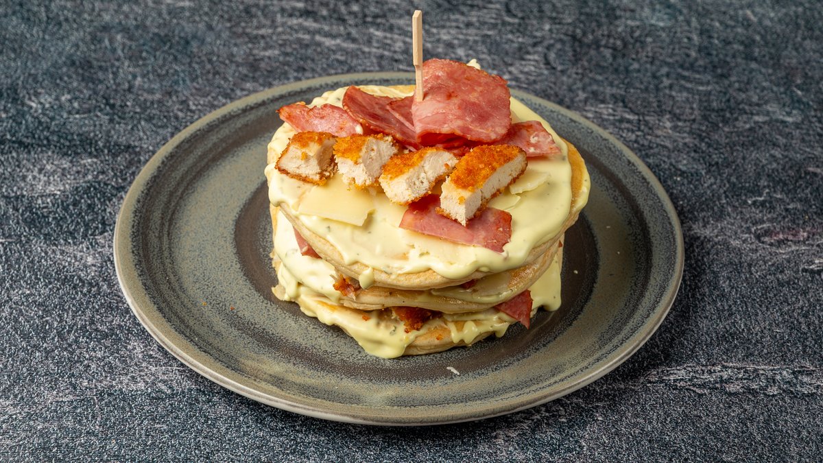 Παραδοσιακές τηγανίτες, αυγά, crispy bacon, flakes παμρεζάνας, ντοματίνια, πράσινη σαλάτα, σως