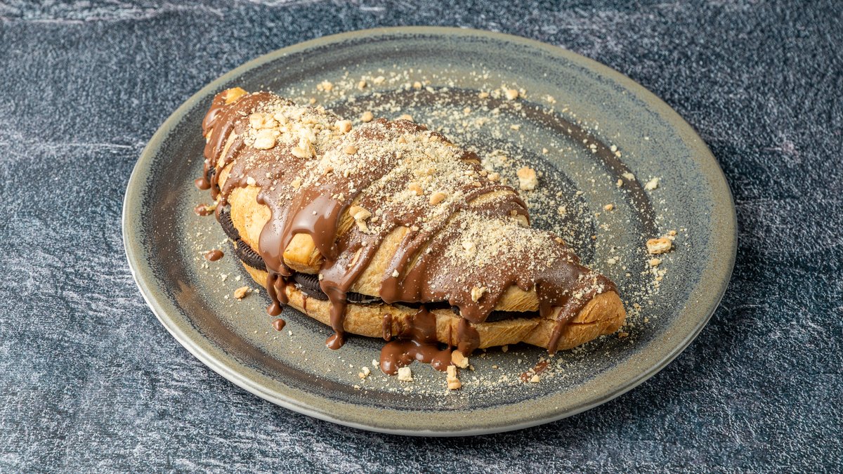 Με πραλίνα φουντουκιού, κρέμα bueno, μπισκότο, σταγόνες σοκολάτας