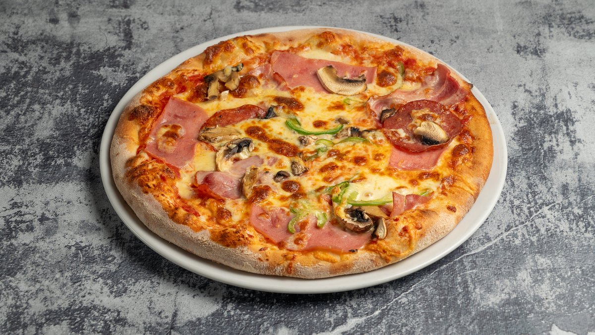 Με σάλτσα, τυρί, ζαμπόν, μπέικον, πιπεριά και μανιτάρια