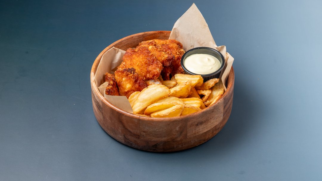 Golden ζουμερά φιλέτα κοτόπουλο με τη μυστική Jenko συνταγή. Συνοδεύεται από τραγανές τηγανητές πατάτες και 4 dips