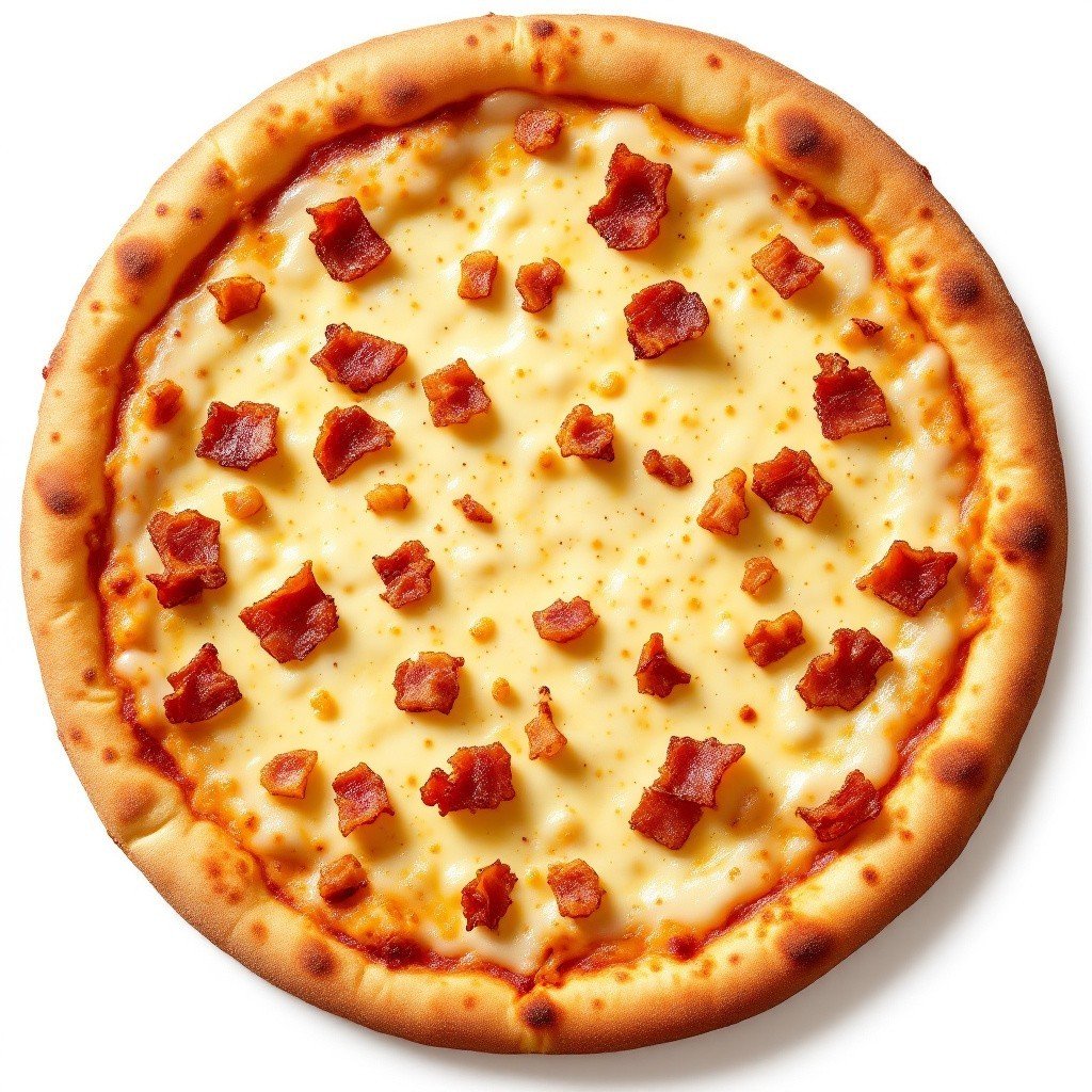 Roman pizza με mozzarella, τραγανό κοτόπουλο και μπέικον. Συνοδεύεται από τηγανητές πατάτες και μιξ τριπλής σως (french, mayp, bbq)
