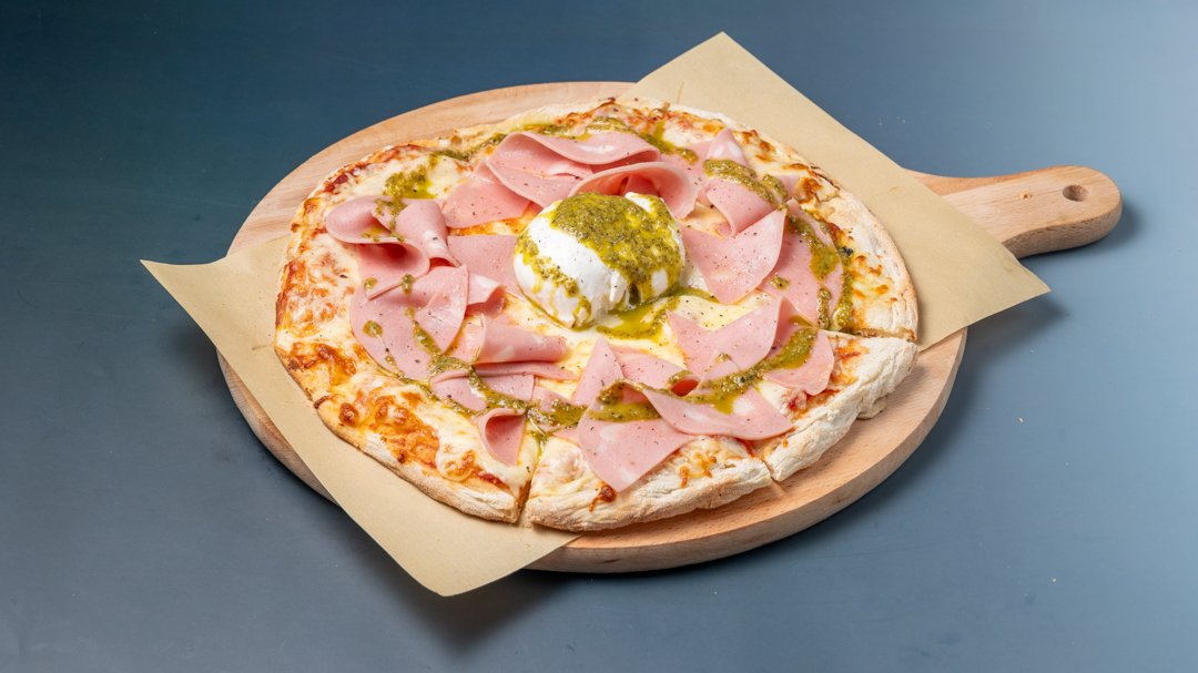 30 cm. Με σάλτσα ντομάτας, mozzarella, μορταδέλα, πέστο βασιλικού και τυρί buratta