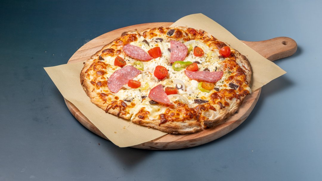 30 cm. Με σάλτσα ντομάτας, mozzarella, Λευκαδίτικο σαλάμι, κρεμμύδι, πιπεριά, φέτα, ελιές, λάδι μυρωδικών και ρίγανη