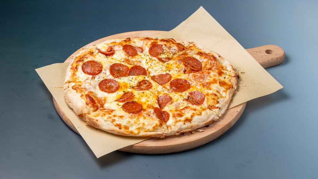 30 cm. Με σάλτσα ντομάτας, mozzarella, πεπερόνι 12μηνης ωρίμανσης και ρίγανη