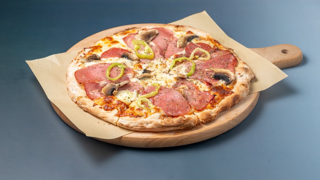 30 cm. Με σάλτσα ντομάτας, mozzarella, ζαμπόν, μπέικον, πιπεριά, μανιτάρια και λουκάνικο