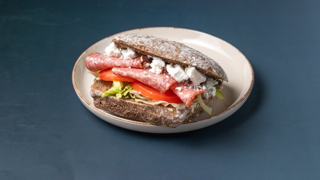 Ζεστό σάντουιτς με ψωμί χαρουπιού, iceberg, ντομάτα, φέτα, πιπεριά, σαλάμι και πέστο βασιλικού. Warm carob bread sandwich with iceberg, tomato, feta cheese, pepper, salami, and basil pesto.