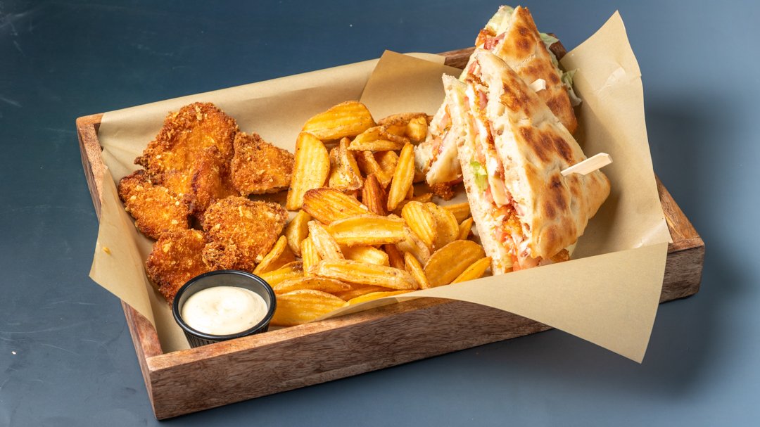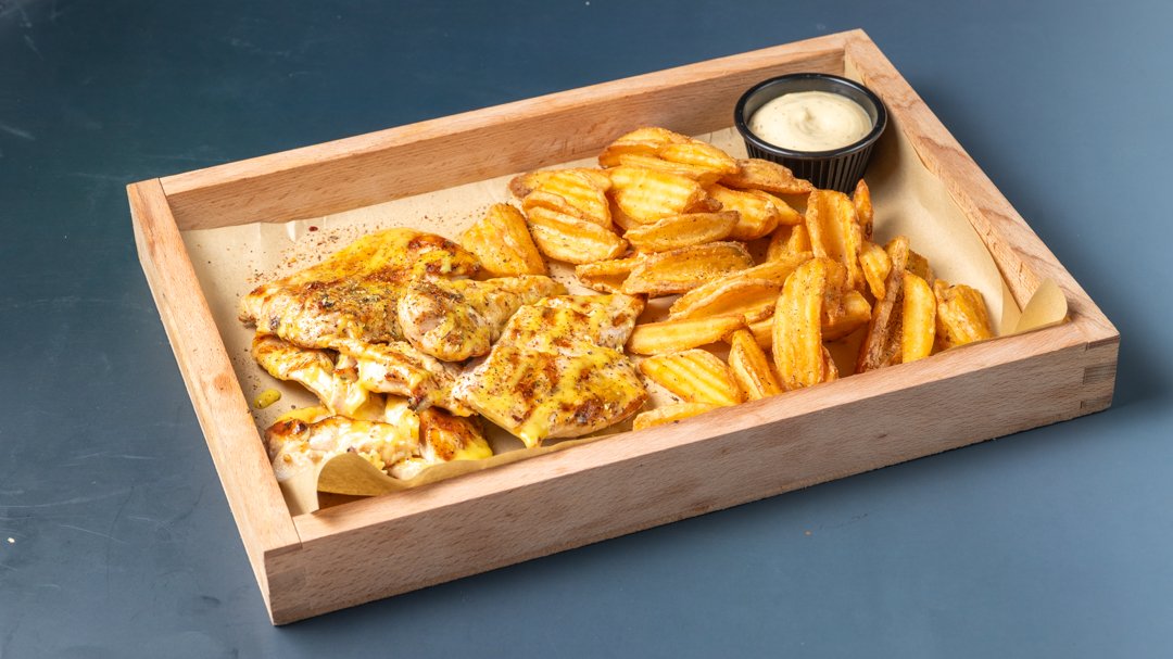 Ζουμερό, ψητό στήθος κοτόπουλο και μπούτι κοτόπουλο μαριναρισμένο με μουστάρδα. Συνοδεύεταιμε τηγανητές πατάτες και 2 dips