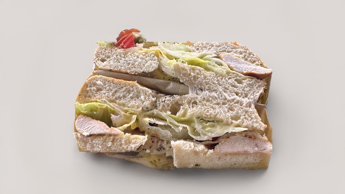 Τραγανό bagel με παπαρουνόσπορο, iceberg, ντομάτα, σως Caesar, φιλέτο κοτόπουλο και τυρί Grana Padano. Poppy seed bagel with iceberg lettuce, tomato, Caesar sauce, chicken fillet, and Grana Padano cheese.