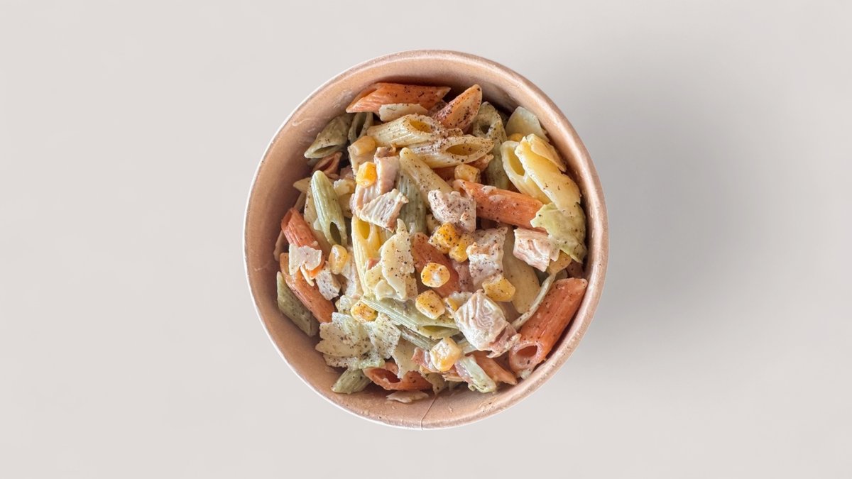 Σαλάτα με τρίχρωμες πένες, φιλέτο κοτόπουλο, σως Caesar, τραγανό μπέικον, παρμεζάνα μακράς ωρίμανσης, καλαμπόκι και φρέσκο μαρούλι iceberg.