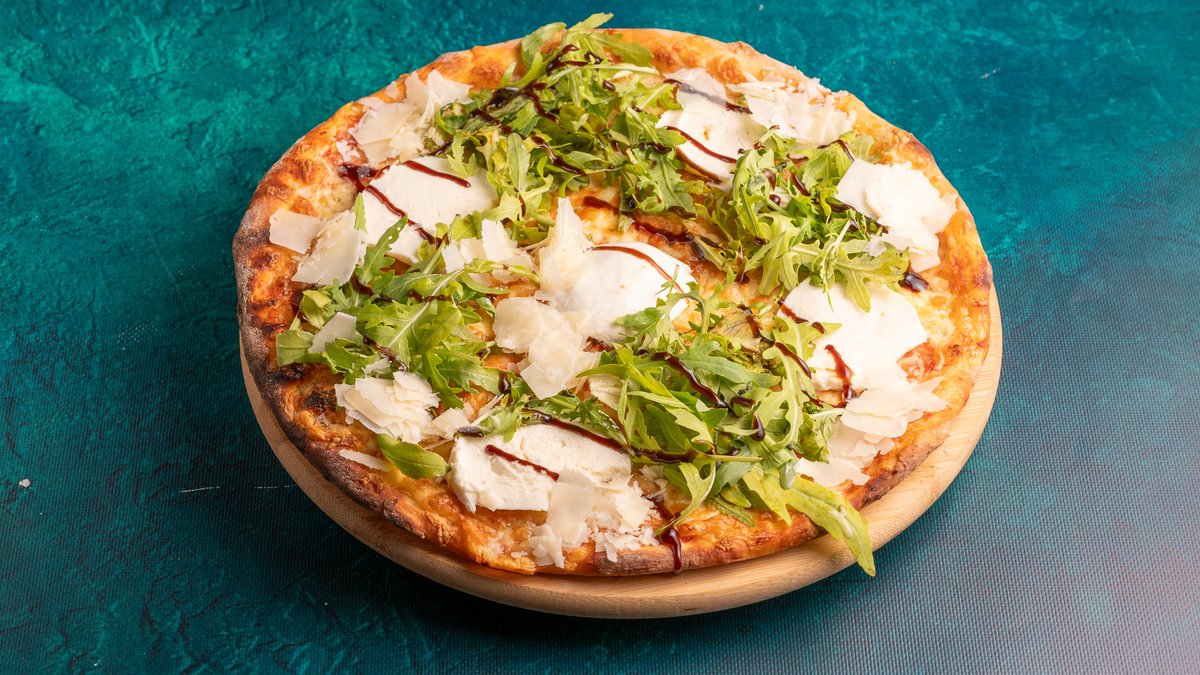 Με σάλτσα ντομάτας, mix τυριών (gouda και μοτσαρέλα), ρόκα, φρέσκια μοτσαρέλα, flakes παρμεζάνας και βαλσάμικο