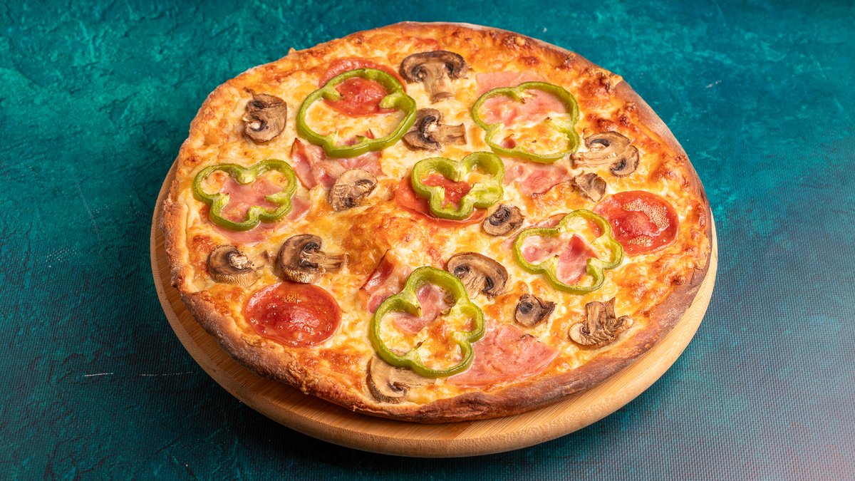 Με σάλτσα ντομάτας, mix τυριών (gouda και μοτσαρέλα), ζαμπόν, μπέικον, πεπερόνι, μανιτάρια και πράσινη πιπεριά
