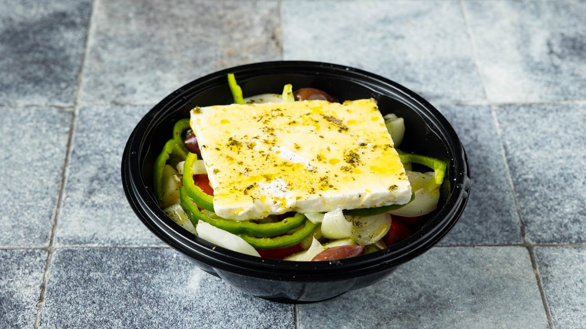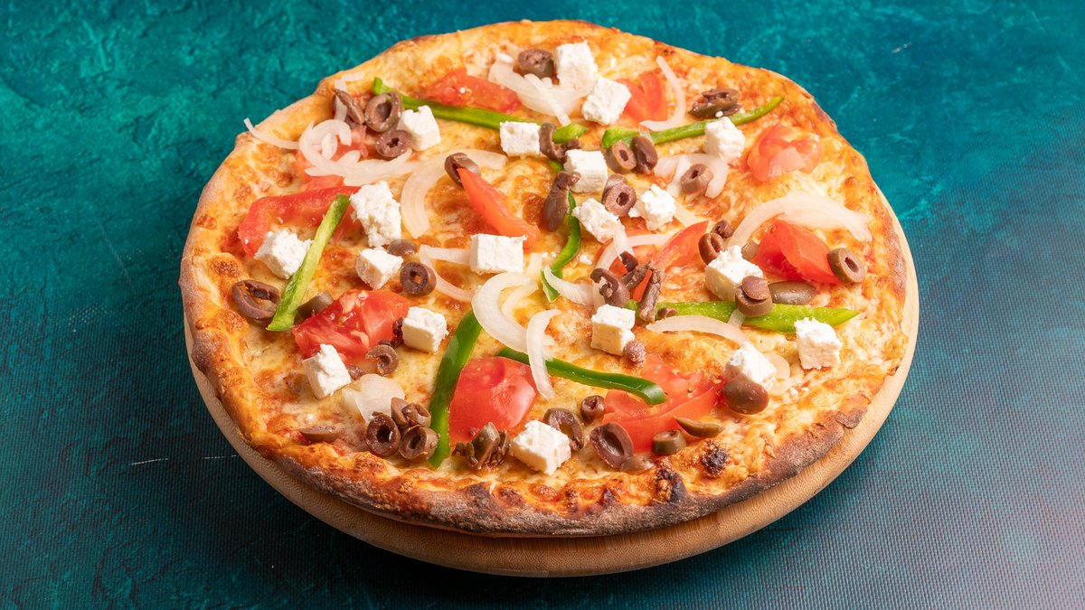 Με σάλτσα ντομάτας, mix τυριών (gouda και μοτσαρέλα), ντομάτα, κρεμμύδι, πιπεριά πράσινη, ελιές και φέτα