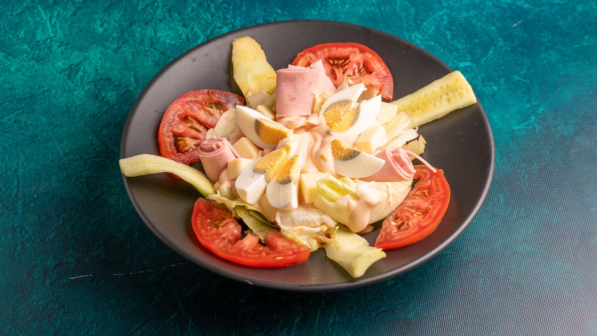 Σαλάτα με iceberg, ντομάτα, αγγούρι, αυγό βραστό, gouda, ζαμπόν και chef σως