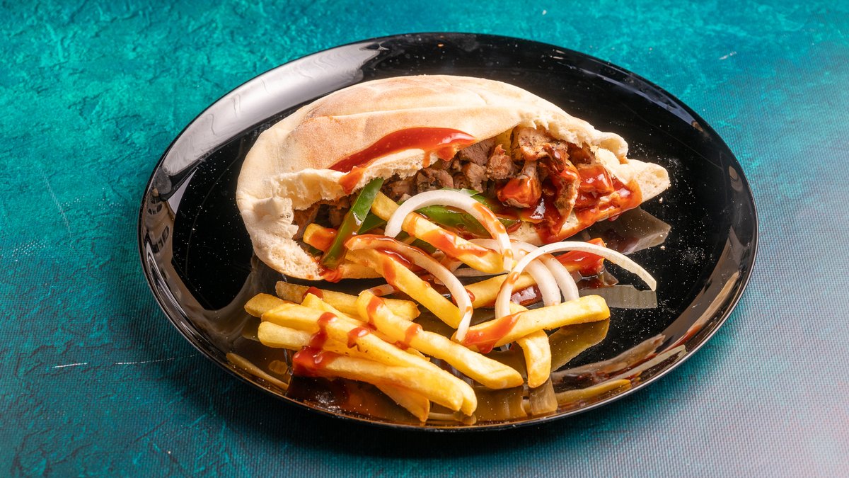 Ψωμάκι ανοιχτό σε σχήμα τσέπης με μπριζολάκι χοιρινό, πατάτες τηγανητές, κρεμμύδι, πιπεριά πράσινη και BBQ σως