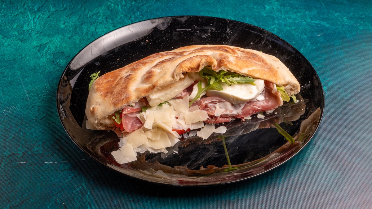 Ψωμάκι ανοιχτό σε σχήμα τσέπης με προσούτο, ρόκα, flakes παρμεζάνας, mix τυριών (gouda και μοτσαρέλα) ντομάτα και βασιλικό