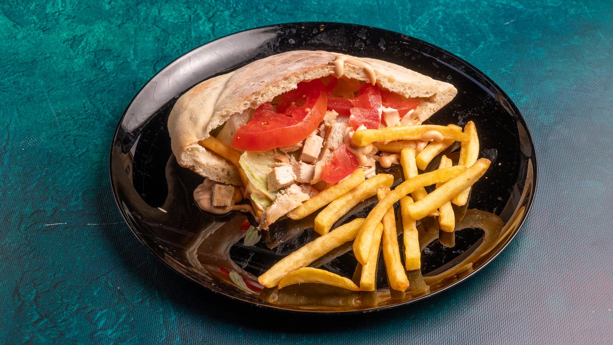 Ψωμάκι ανοιχτό σε σχήμα τσέπης με φιλέτο κοτόπουλο, πατάτες τηγανητές, ντομάτα, μαρούλι και ροζ σως
