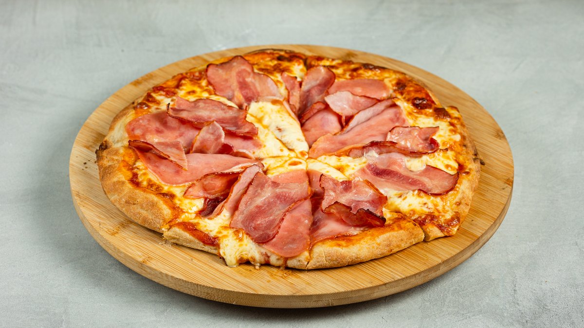 Με σάλτσα ντομάτας, mix τυριών (gouda και μοτσαρέλα), μπέικον και πιπεριά πράσινη