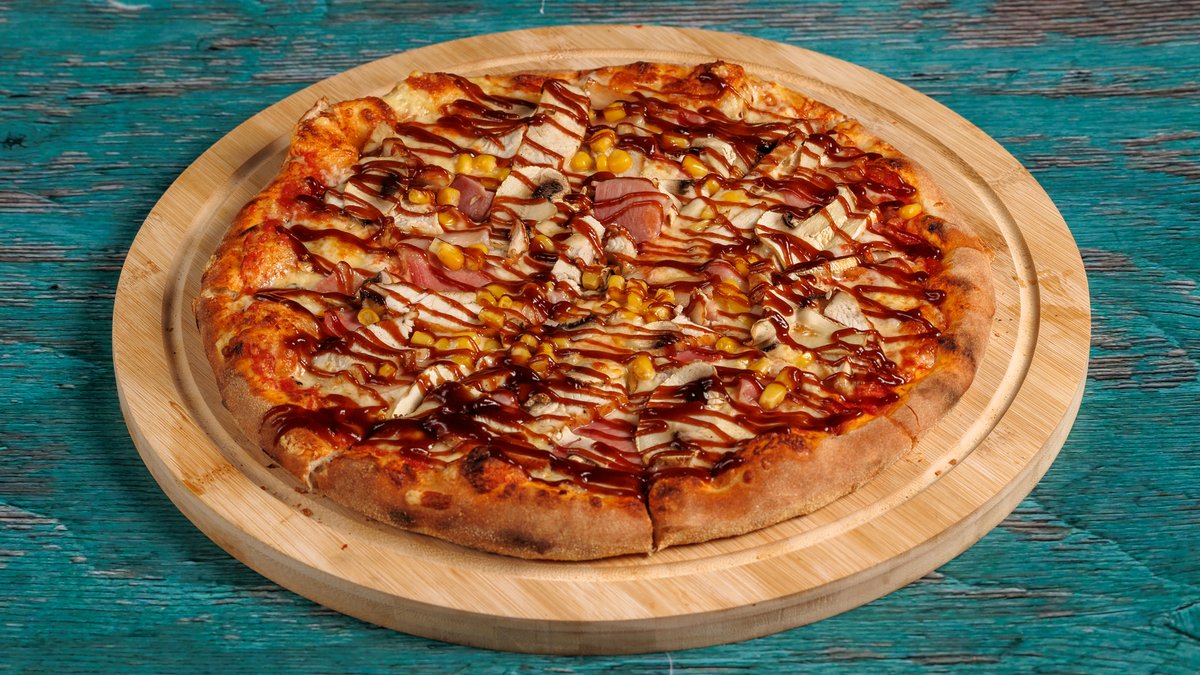 Με σάλτσα BBQ, mix τυριών (gouda και μοτσαρέλα), φιλέτο κοτόπουλο, κρεμμύδι και πιπεριά πράσινη
