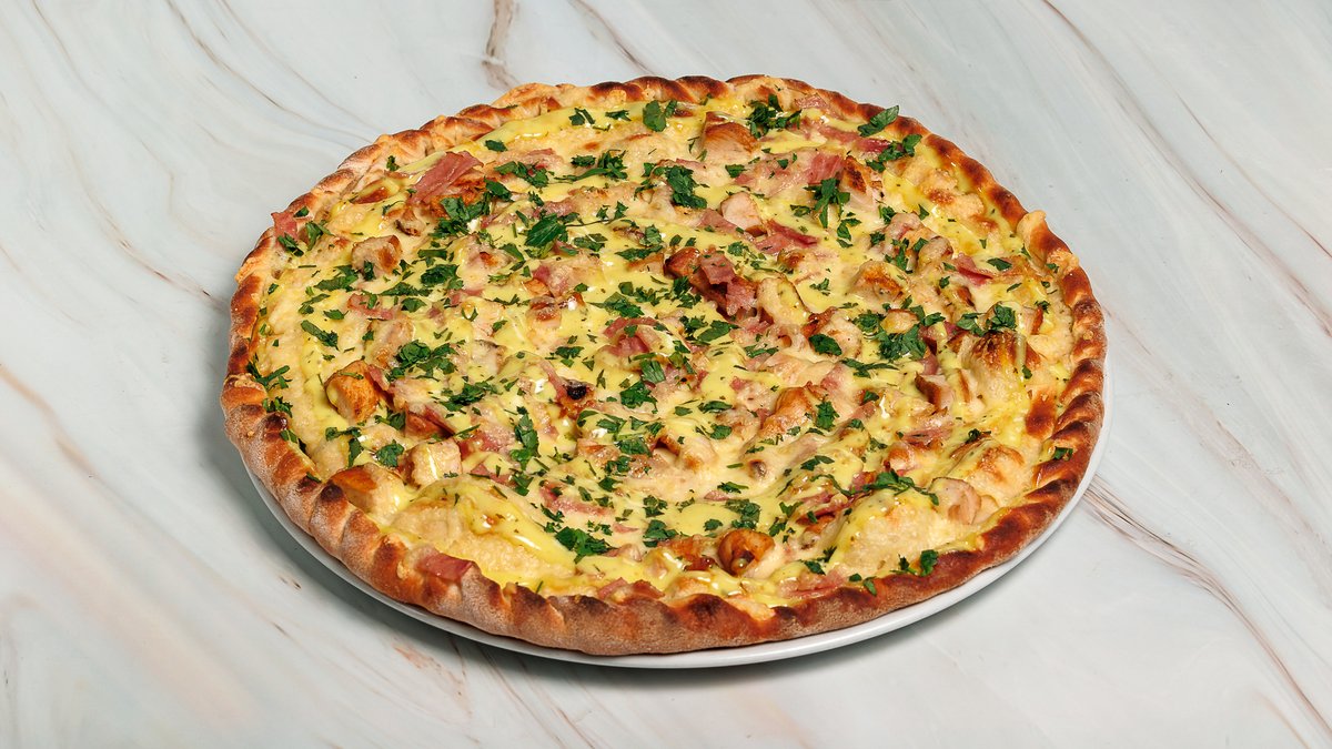 Με σάλτσα ντομάτας, mix τυριών (gouda και μοτσαρέλα), κοτόπουλο φιλέτο, κρέμα γάλακτος και μανιτάρια