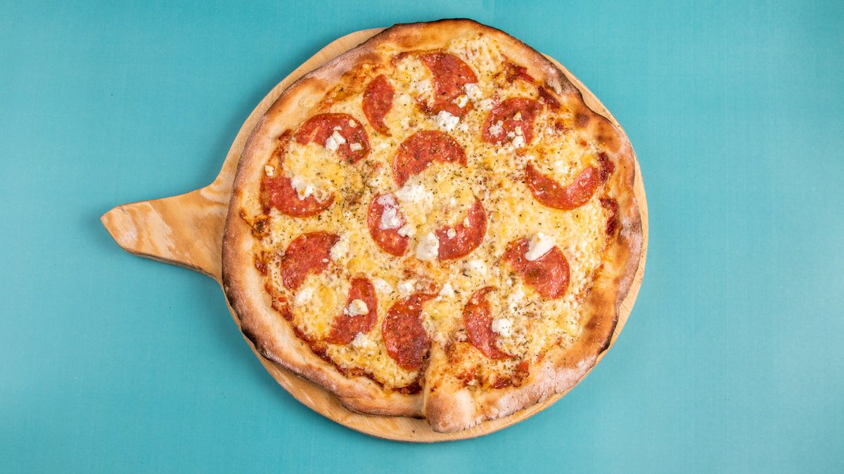 Με σάλτσα ντομάτας, mix τυριών (gouda και μοτσαρέλα), σαλάμι αέρος και πεπερόνι