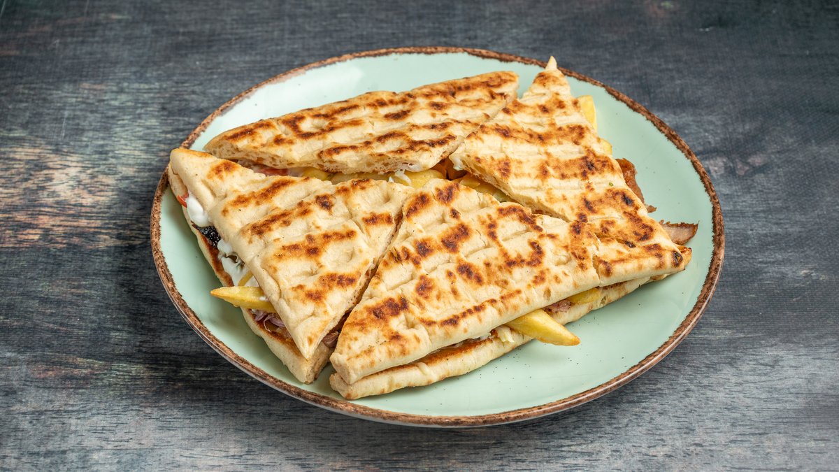 Πίτα Θράκα με γύρο κοτόπουλο, κρεμμύδι, πιπεριά, ντομάτες, πατάτες, τυρί, μαγιονέζα και ketchup