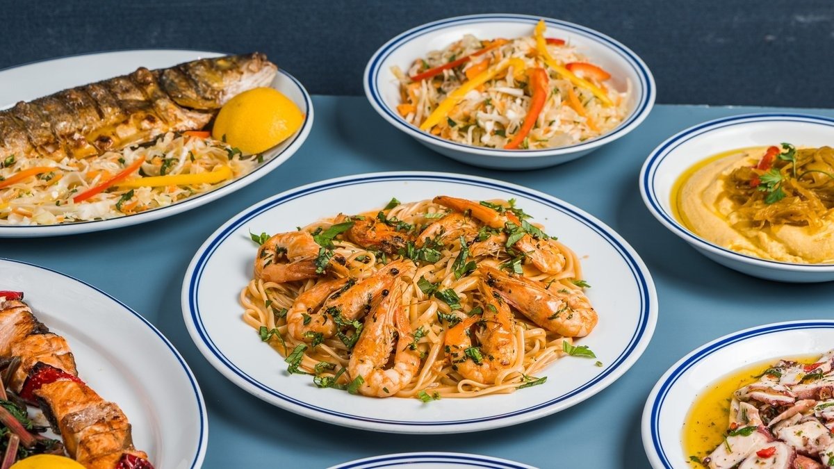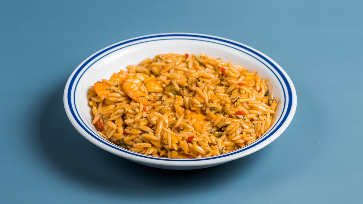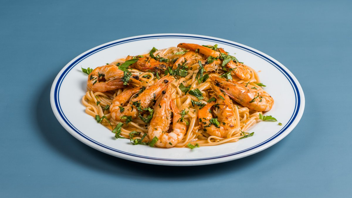 Με γαρίδες, μαρούλι, ντομάτα και σως ταρτάρ. Συνοδεύεται από πατάτες τηγανητές