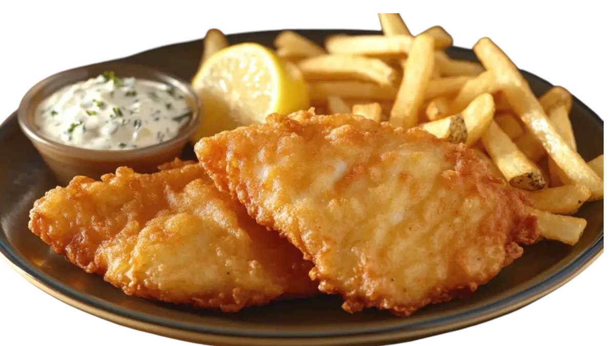 Με μπιφτέκι ψαριού, μαρούλι, ντομάτα και σως ταρτάρ. Συνοδεύεται από πατάτες τηγανητές