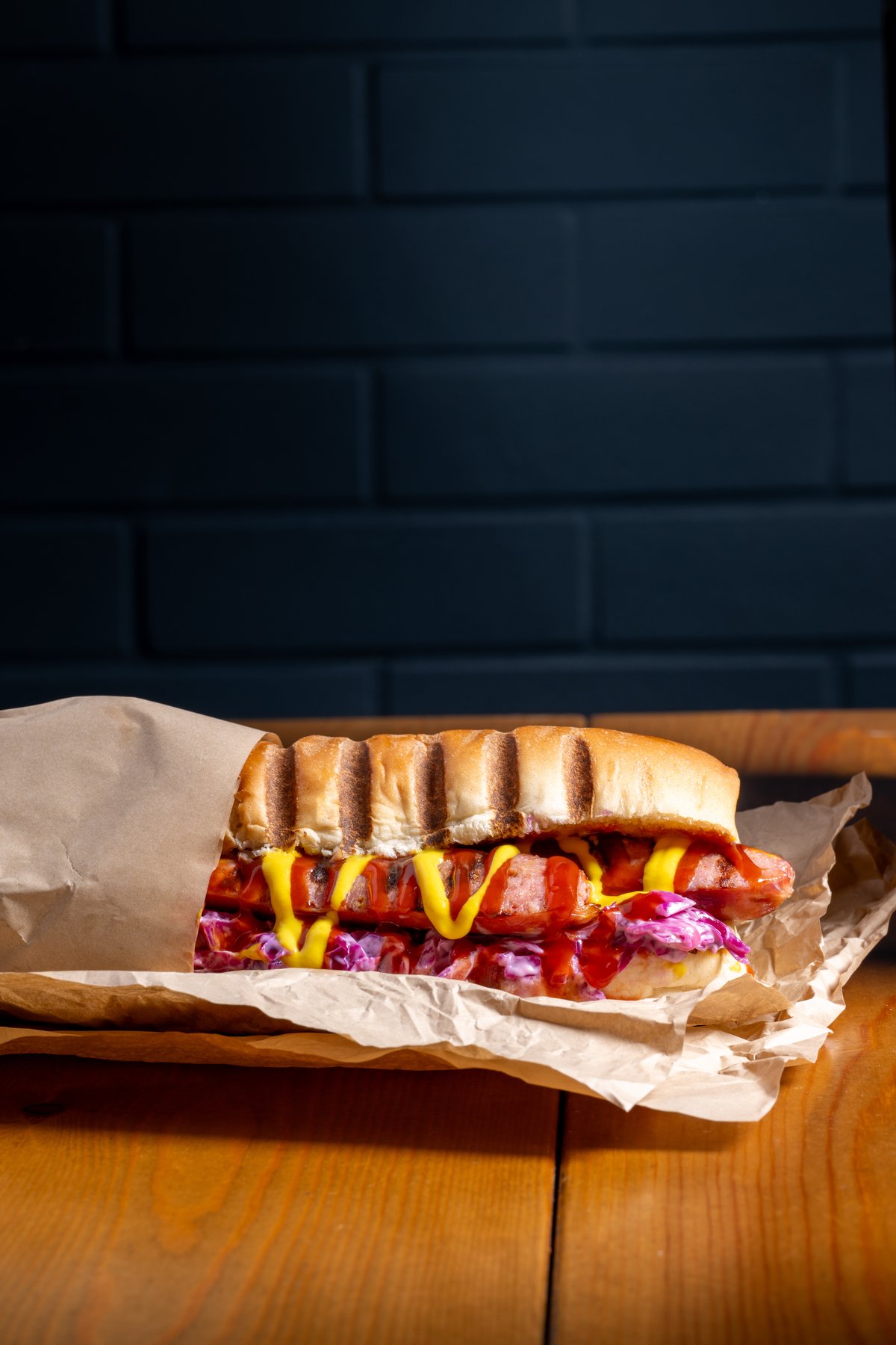 Αφράτο ψωμάκι brioche, με 2 λουκάνικα Φρανκφούρτης, σαλάτα coleslaw, κέτσαπ, μουστάρδα